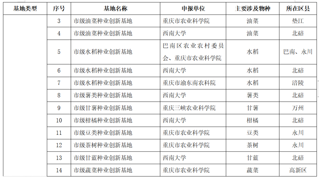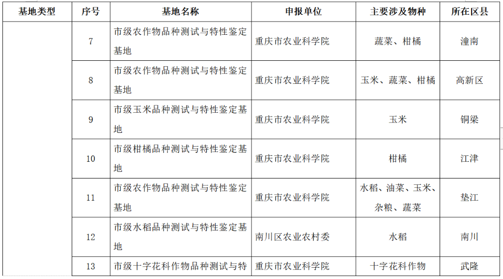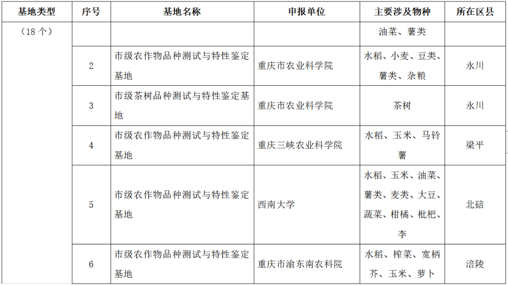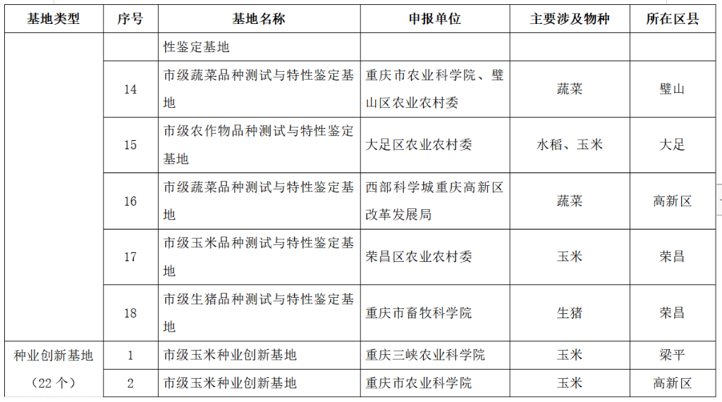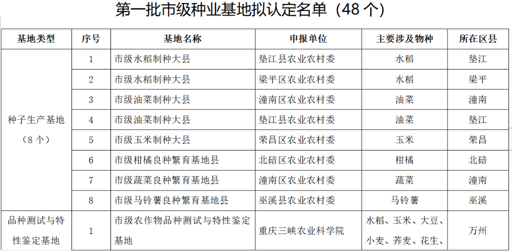 今年3月,重庆正式启动第一批市级种业基地认定工作,积极接受社会申报。经复查、审核、公示,最终认定第一批市级种业基地48个,其中种子生产基地8个、品种测试与特性鉴定基地18个、种业创新基地22个。