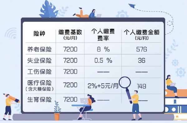 问:李女士是位证劵从业人员,每月工资为7200元,单位在为其缴纳2022年社会保险费时,缴费基数是多少?她个人每月需由单位代扣多少社会保险费?