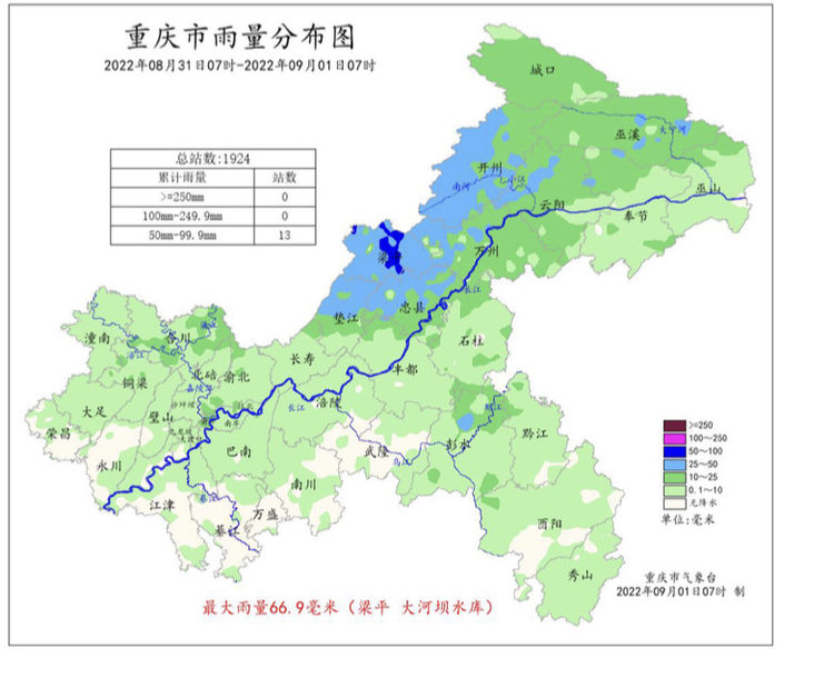 9月1日,上游新闻记者从重庆市气象台获悉,8月31日7点~9月1日7点,重庆各地阴天有阵雨或分散阵雨,东北部部分地区雨量中雨到大雨,局地暴雨;梁平区的13个雨量站达暴雨,最大雨量66.9毫米,在梁平区大河坝水库。