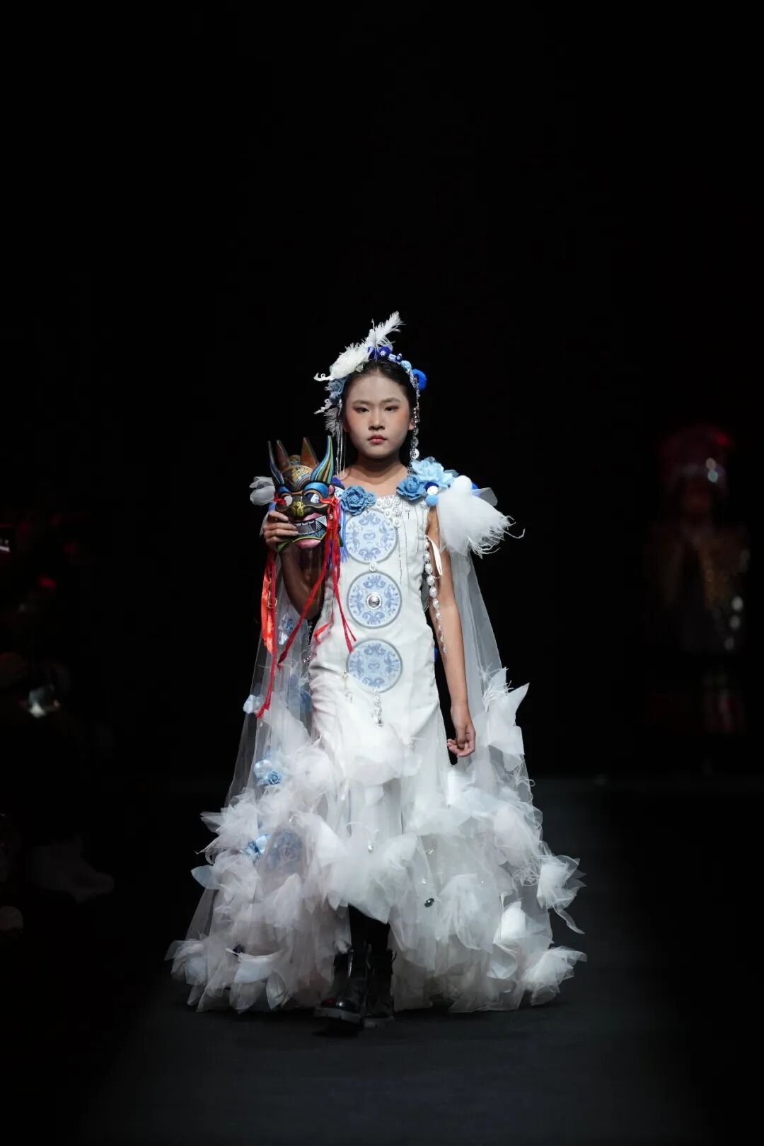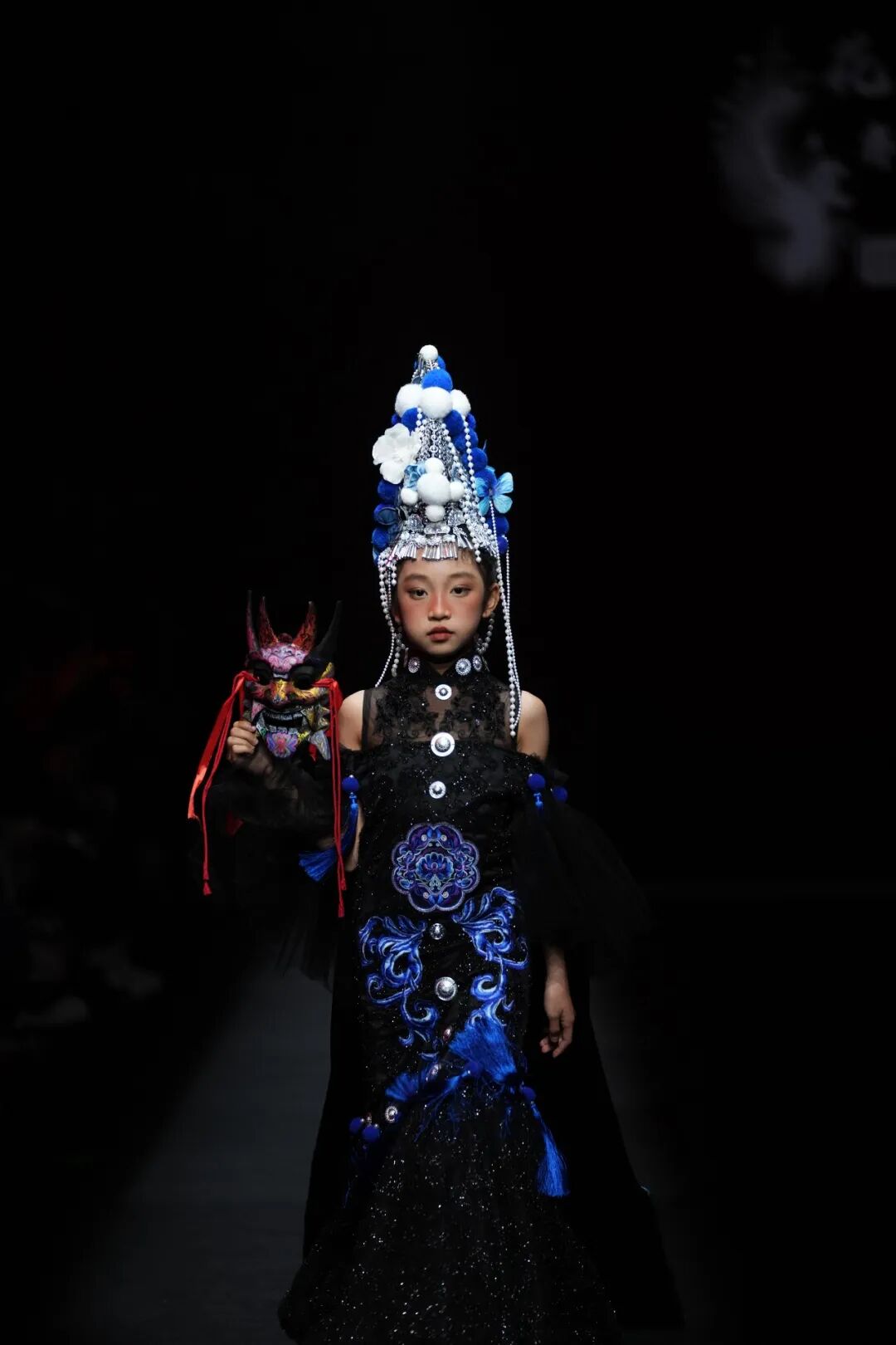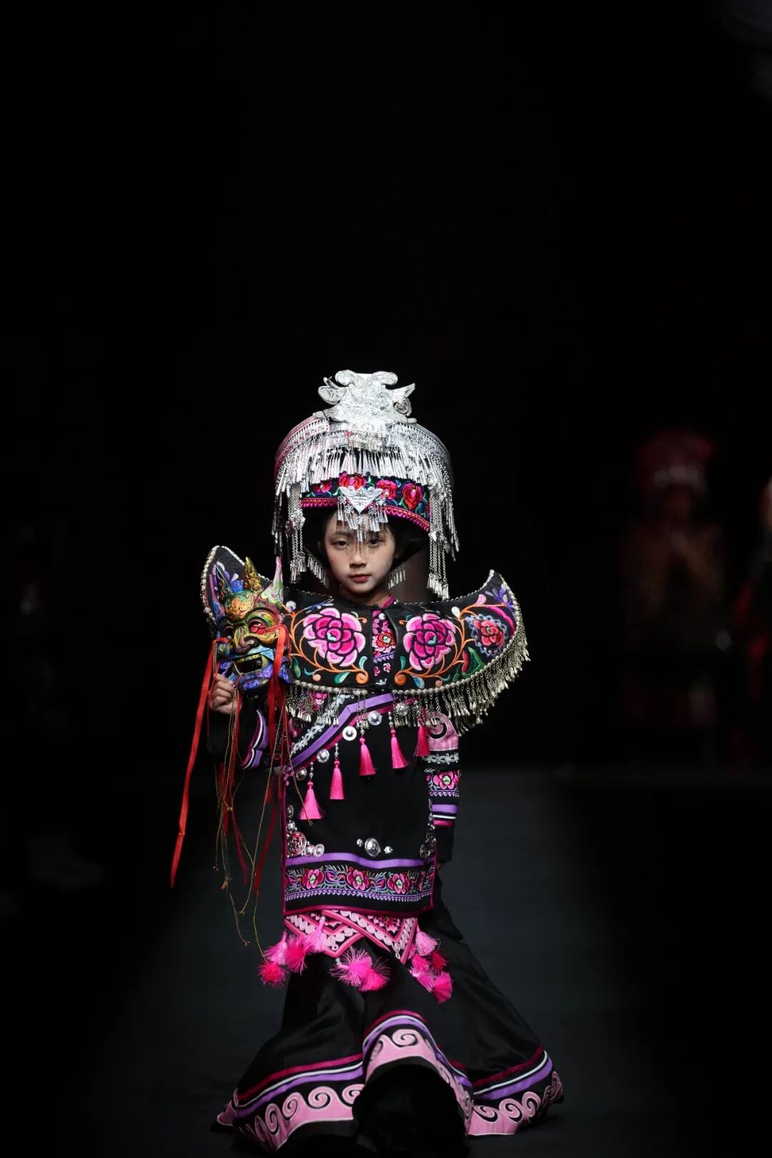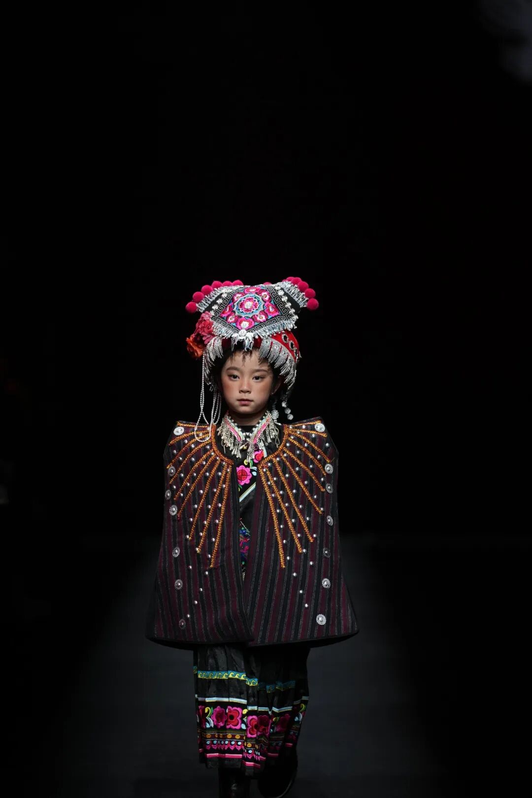 专场秀中,服饰分为儿童装与成人装两大系列,精准覆盖不同群体审美需求。其中46套儿童装围绕彝绣传统纹样与现代潮流的融合,打造了“国风古韵的国潮路线、唯美梦幻的绿野仙踪、清雅脱俗的青花系列、传统纹样的现代服饰改良”四大主题路线,将火焰纹、葫芦纹等经典彝绣元素与儿童服饰的灵动特质相结合,兼具观赏性与实用性。其余23套成人装则主打“民族韵、国之美”,在保留楚雄彝绣核心技艺与文化内涵的基础上,通过简约廓形、轻盈面料的运用,对传统彝绣服饰进行现代化改良,打破了非遗服饰“小众化”“场景化”的局限,让彝绣元素能够自然融入日常穿搭,实现了“民族风”与“时尚感”的双向奔赴,彰显出东方美学的独特魅力。